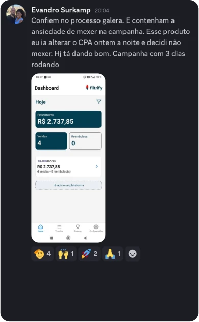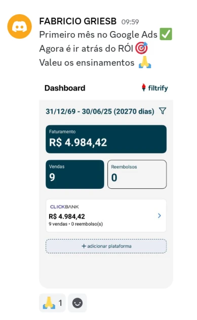 Foi quando conheci o marketing de afiliados e o Google Ads que tudo mudou. No começo foi difícil, investindo o pouco que tinha e acumulando prejuízos, mas no sexto mês faturei R$10 mil e nunca mais voltei pra média.